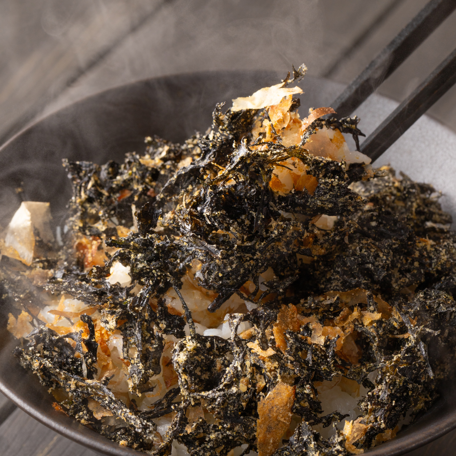 全国から厳選した最高級のばらのりに、2種のかつお節を味と風味にこだわりブレンド。香ばしい燻香と力強い旨みが特長の「荒節」と、半年熟成させて旨みを凝縮した「本枯節」。真昆布のだしとたまり醤油で濃厚に仕上げました。